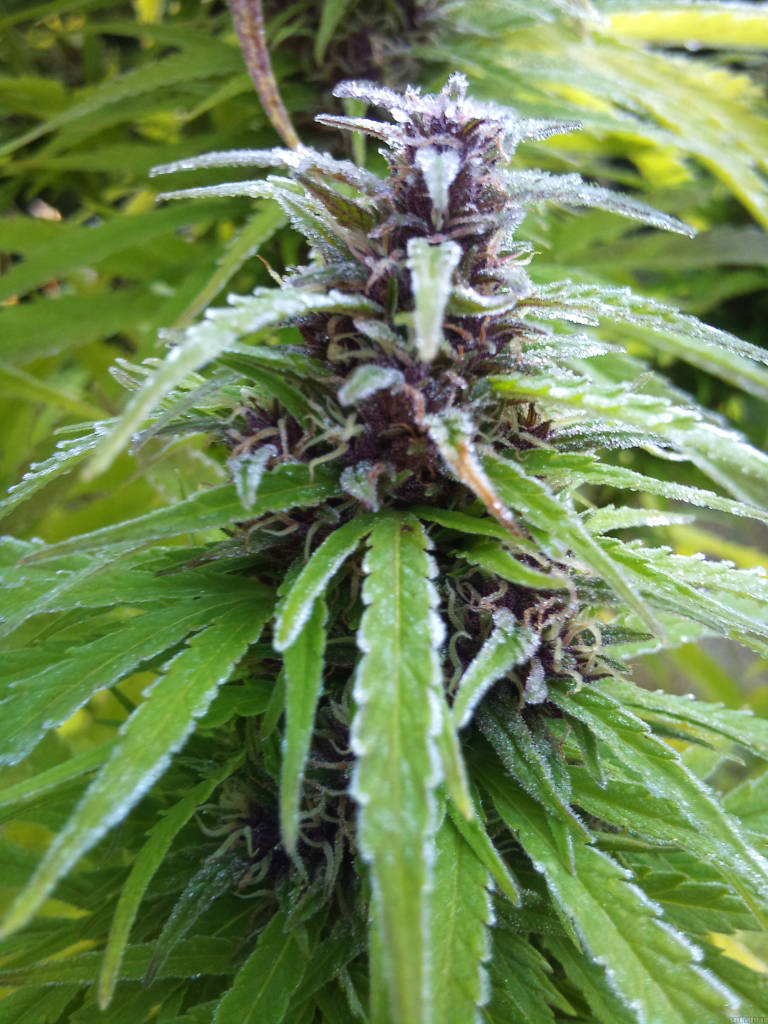 Высаживал в ауте 2012г. на 44сш. аж в двадцатых числах июля (эксперимент). Зацвели примерно через месяц, попутно набирая зелёную массу. К 5 октября кусты были по 1.3м - 1.5м с массивной центральной колой, почти без боковых ветвей. Запах у трёх растений был разный, от почти отсутствующего до ярко выраженного фруктового. Сила накура 7 из 10. Шишки не самые плотные, лиственные. Харвест был вынужденный, преждевременный, возможно, через неделю-другую показатели бы улучшились. Сорт явно аутдорный, посадил бы в начале мая, уверен, ёлки бы вымахали огромные!